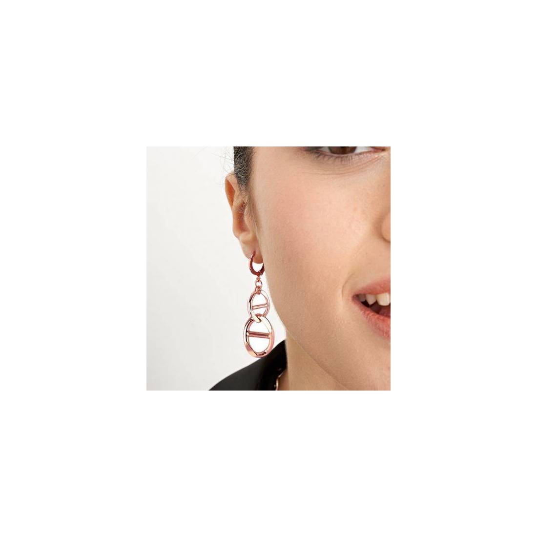 Orecchini pendenti in bronzo rosa lucido con due maglie di catena traversino a due lati piatti e chiusura al lobo con gancetto.
