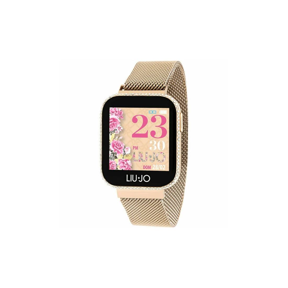 Smartwatch dal design dinamico e cosmopolita, realizzato con una elegante cassa in acciaio goldorse e un cinturino in maglia mesh con chiusura di tipo milanese clasp.