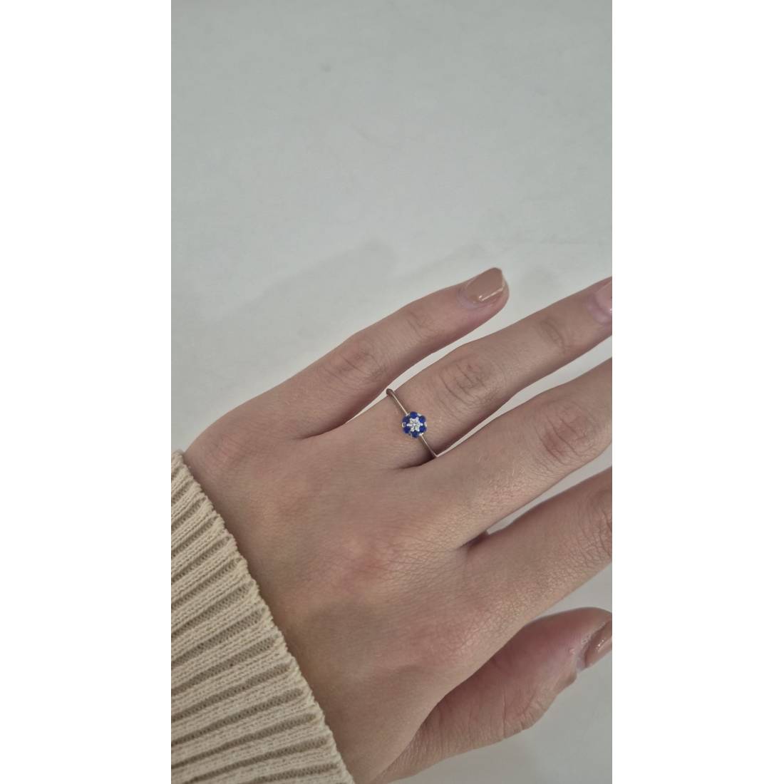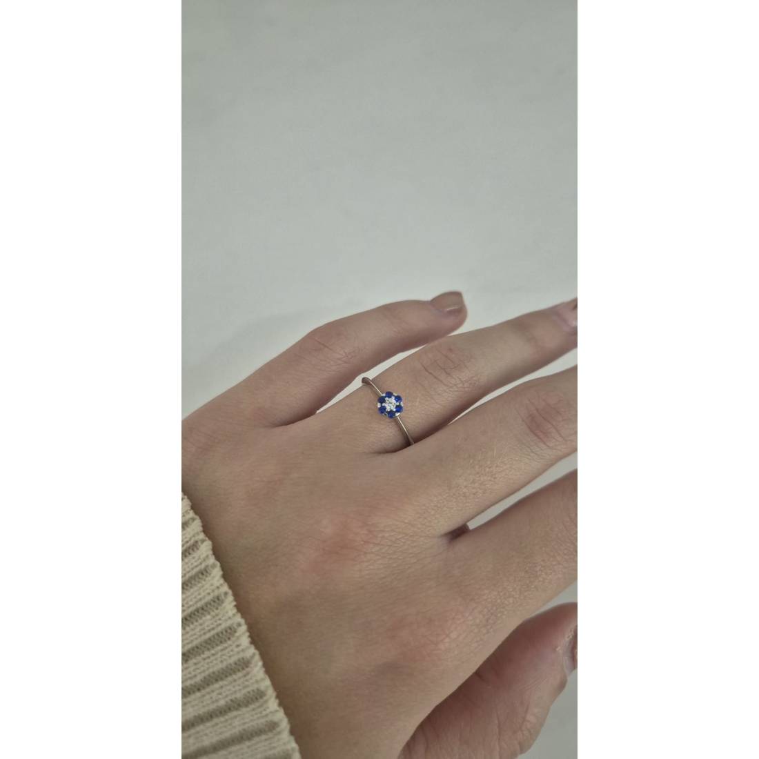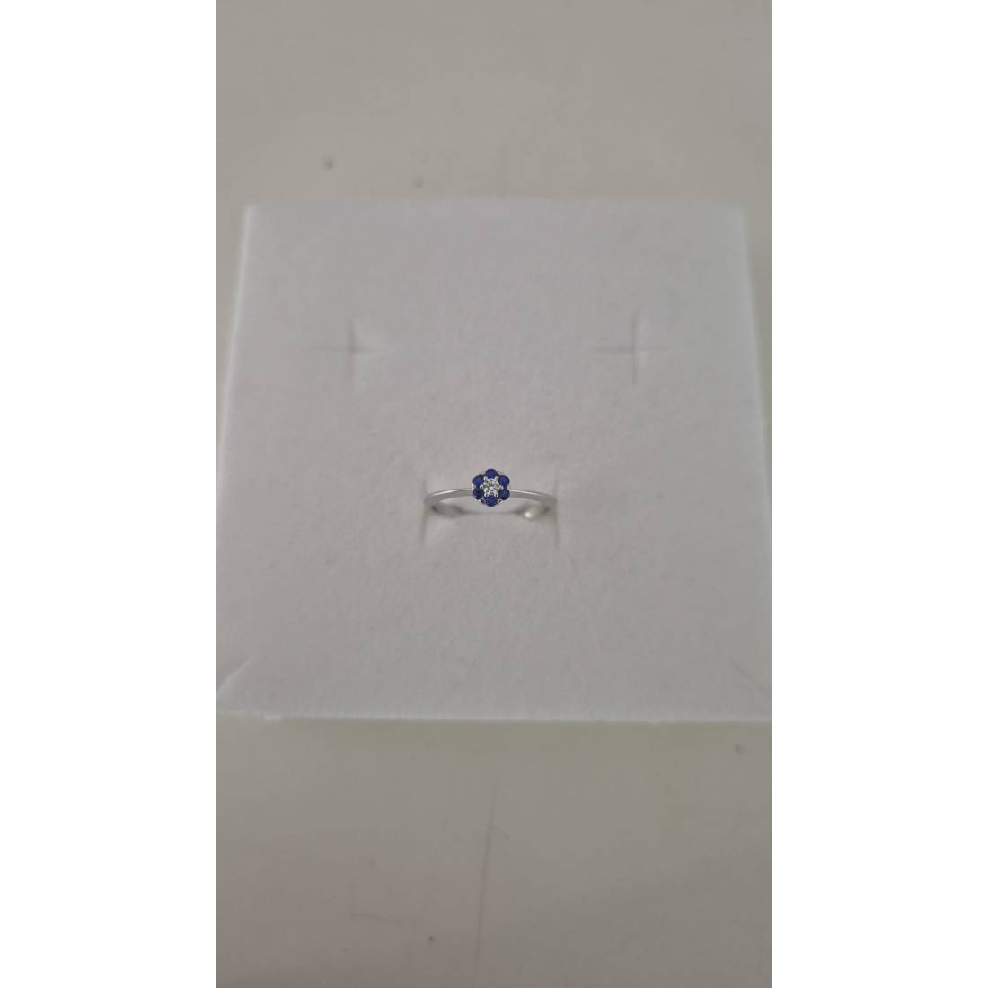 ANELLO Donna Fiore Centrale ORO BIANCO 18 Karati 750% Con Zirconi Blu E Bianchi