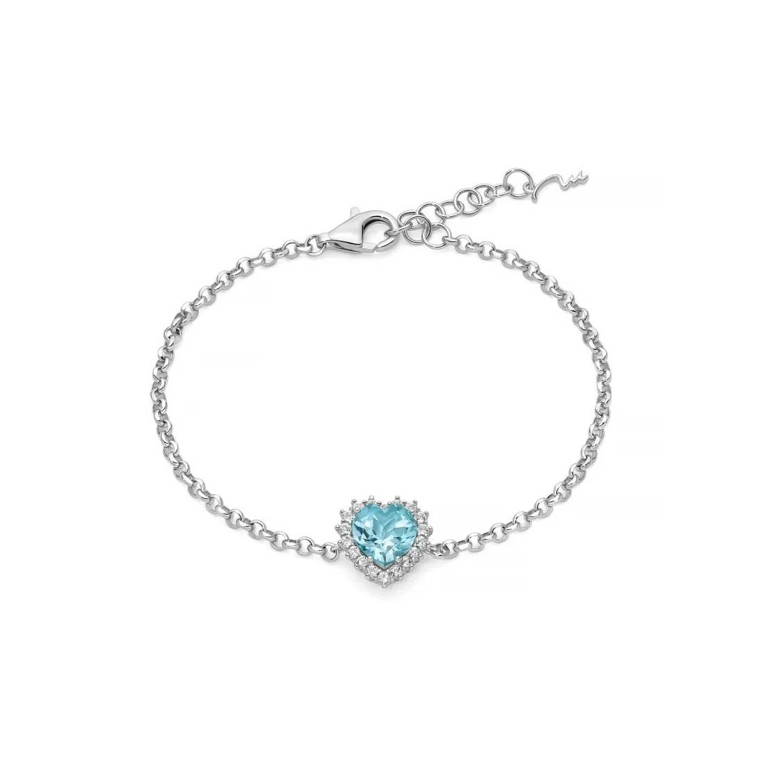 La Gemma del Cielo, una gemma naturale dal colore azzurro e trasparente, è protagonista assoluto di questo gioiello. E' incastonata in un centrale a cuore, con taglio sfaccettato e impreziosito da topazi bianchi che ne valorizza la preziosità. Un gioiello prezioso e senza tempo dedicato a madri, sorelle, figlie e amiche.