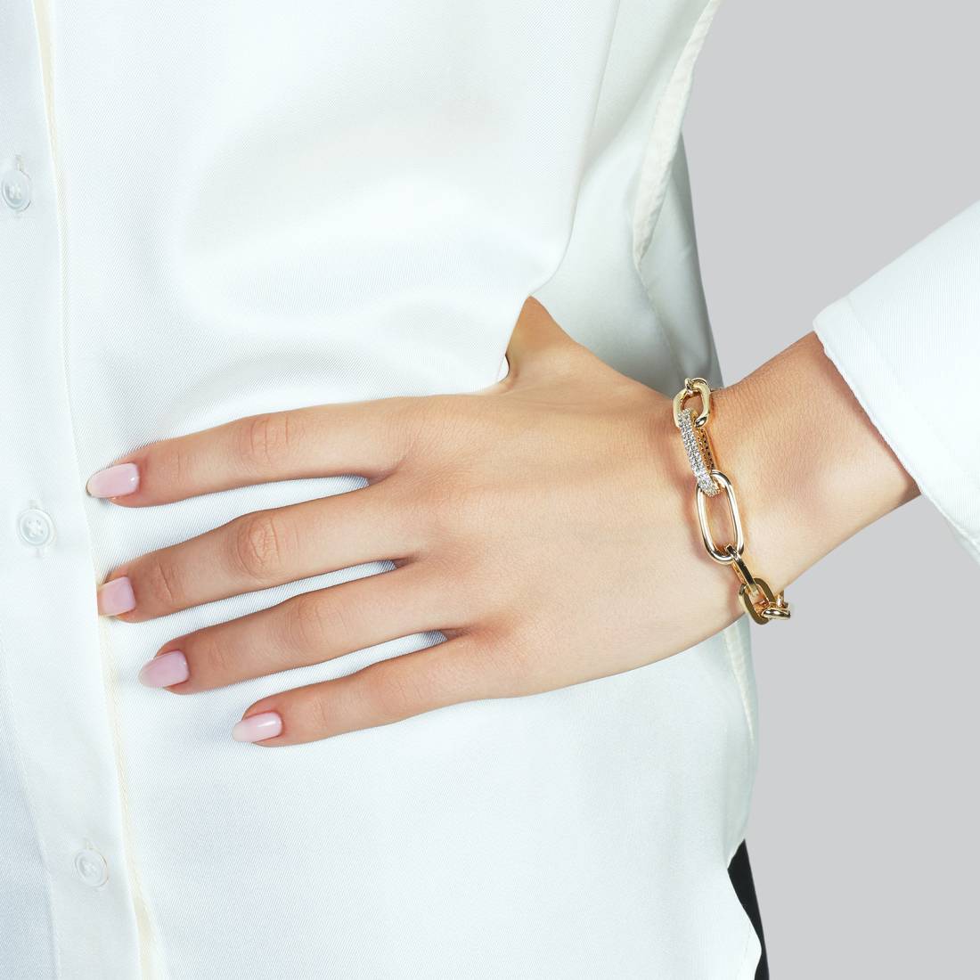 Bracciale catena placcata oro con dettaglio in zirconi. Chiusura a moschettone, misura 20,00 cm. Rendi unico il tuo look con l'elegante design di questo bracciale donna in catena dorata. La maglia con zirconi brillanti è il dettaglio fashion che aspettavi da tempo. Acquista ora online con spedizione gratuita o scegli questo bracciale nelle migliori gioiellerie. Aggiungi un pacchetto regalo al carrello e fai un dono speciale a chi ami.
