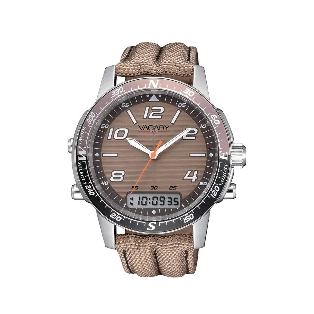 Cassa in acciaio, cinturino in tessuto tecnico. WR 5 bar.